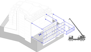 Die gesamte Fassade wurde in nur fünf transportable Elemente mit bis zu 21 m Länge und etwa 5 m Höhe zerlegt. Das Gewicht der einzelnen Elemente betrug dabei bis zu 80 Tonnen. Für die 12 m lange und 15 m hohe Fassade des kleineren Gebäudes daneben reichte eine Zerlegung in drei Geschosselemente aus.