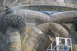 Auf Basis dieses ersten Befundes legte man noch im Oktober 2015 Musterflächen an, um die geeignetsten Reinigungsarten zu testen. Die beste und schonendste Methode zur Abnahme des Bewuchses, der Stäube und des Vogelkotes konnte mit dem Heißwasser-Hochdruckreiniger HDS 13/20 in der Dampfstufe bei halbierter Wasserleistung (etwa 650 l/h) erzielt werden. Zum Einsatz kam eine oberflächenschonende Dampfdüse, die bei einem Abstand zum Sandstein von etwa 10 bis 20 cm ungefähr 0,5 bar Oberflächendruck produziert. Die Dampftemperatur wurde bei 145 °C eingeregelt. Die hohe Temperatur stellt sicher, dass einerseits nach der Reinigung verbliebene biogene Restpartikel und Sporen auch in den Poren des Gesteins abgetötet werden und eine Wiederansiedlung mittelfristig verhindert wird. Andererseits kann so auch auf den Einsatz von Reinigungschemie verzichtet werden.