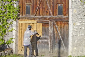 Glasbruch mit etwa 0,2 mm ist das gängigste Strahlmittel, da Glas scharfkantiger, härter und schwerer als etwa Bicarbonat ist. Vor allem auf Hart- und Weichholz erzielt man damit das beste Resultat, auch wenn sie deckend gestrichen waren. Vor allem Fensterläden mit ihren Ritzen und Kanten lassen sich so zügig entschichten. Bei mehrfach gestrichenem Fachwerk kann man mit Sand beginnen und auf Glasbruch wechseln, wenn man ans Holz kommt. Maler Werner Marti aus Buchs (www.marti-malerei.ch) hat ein etwa 100 Jahre altes Fachwerkhaus saniert. Dessen erstes Obergeschoss und das großzügige Dachgeschoss sind ein Holzbau, auf drei Seiten befinden sich aufwendige Balkone. Das Haus mit seinen wertvollen Schnitzereien sollte neu gestrichen werden. Es war mit ein bis zwei Anstrichen Ölfarbe versehen, die mehrmals mit farblosem Sanieröl aufgefrischt worden waren. Diese Ölschicht war stark verschmutzt, da das Objekt an einer stark befahrenen Hauptstraße steht. Die verschmutzte Ölschicht wurde entfernt und der Untergrund für einen neuen Ölfarbanstrich vorbereitet. Die Fassadenflächen wurden mit Olivin bis 0,2 mm gestrahlt. Olivin ist eine Sandart, die mit 6,5 bis 7 Mohs relativ hart, scharfkantig und mit 3,3 g/cm³ ziemlich schwer ist. Düsengröße war 4,8 mm, Druck etwa 5 bar. Die Schnitzereien wurden mit Glasbruch behandelt, gleiche Körnung, Düsengröße und Druck. Kreuzstöcke und Erker wurden mit Bicarbonat gestrahlt. Düsengröße 2 mm, Druck 3 bar. So mussten die Gläser nicht abgedeckt werden. Insgesamt wurde etwa 450 m² Fläche mit rund 1500 kg Strahlgut gestrahlt. Vorher wurde jeweils eine Gerüstseite mit Planen verhängt. Es kamen ein Baukompressor mit einer Leistung von 3000 l/min und eine Feinstrahlanlage der Marke Gritco Typ „Pequena-RC“ zum Einsatz. Ein Nachschleifen entfiel, da der Grundanstrich bestehen blieb. Nach den Arbeiten wurde das Strahlgut mit Staubsaugern aufgenommen und fachgerecht entsorgt. Für den Neuanstrich verwendete Maler Marti eine Ölfarbe.