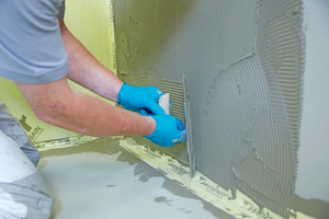 Um die Haftung zu verbessern, sollten saugende Untergründe vor Beginn der Arbeiten grundiert werden. Anschließend wird in allen Anschlussbereichen ein elastisches Dichtband-System (bestehend aus Dichtband, Innenecken, Außenecken und Dichtmanschetten) eingebaut. Dazu bettet man es in ein Mörtelbett ein und drückt es mit Spachtel oder Glätter an. Anschließend kämmt man den Fliesenkleber vollflächig auf den abzudichtenden Untergrund auf.