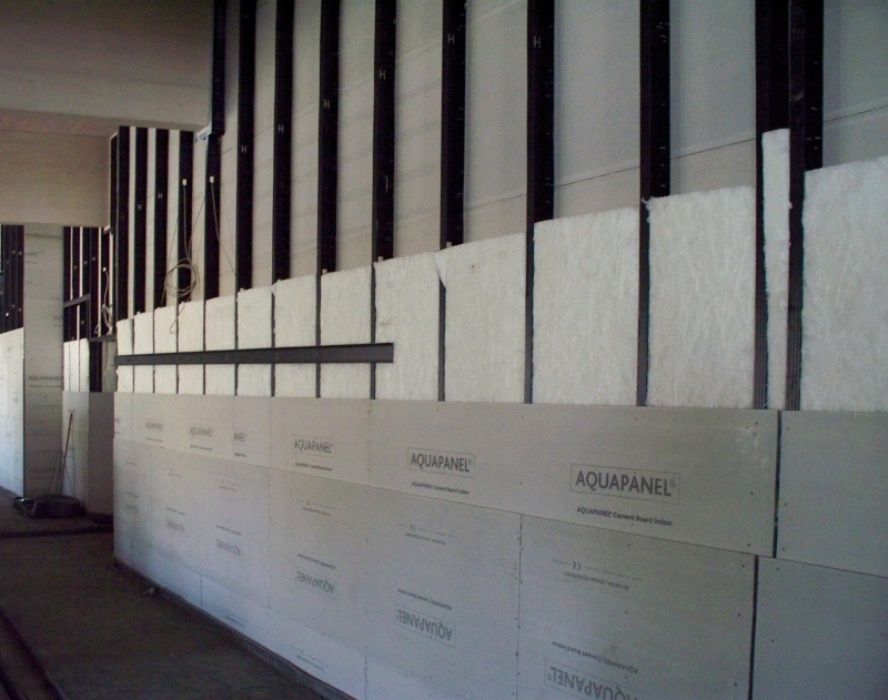tösen Flächenspachtel Aquapanel Q4 Finish. Im unteren Teil der Wand wurde auf Grund der direkten Nähe zum Schwimmbad ein etwa 50 cm hoher Fliesenspiegel angefügt. Für die Vorsatzwand verbauten die Mitarbeiter der Firma Okel insgesamt etwa 1500 m2 Aquapanel Cement Board Indoor. Gewünschte Elektroinstallationen verschwanden unsichtbar im Wandaufbau. Zur Verbesserungen der Raumakustik montierten die Handwerker abschließend noch Ecophon Akustikpaneele an der Wand.