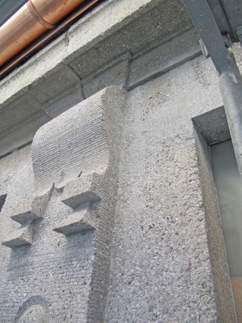 Die rund 100 Jahre alte Fassade aus bewehrtem Stampfbeton ist an der Oberfläche scharriert ausgeführt. Die Betonoberflächen sind rau und unterschiedlich stark abgewittert. Alle Elemente wiesen eine Vielzahl an Schäden auf, wie Hohlstellen, Risse und Betonabplatzungen, zum Teil mit freiliegenden, korrodierten Bewehrungseisen. Die Sanierung erfolgte auf Grundlage eines Instandsetzungsplans, entsprechend der DAfStb-Richtlinie von 2001 sowie der DIN EN 1504. Vorangegangen war eine sorgfältige Bauwerksuntersuchung mit Kartierung der Betonschäden. Alle Instandsetzungsarbeiten wurden unter der Aufsicht eines diplomierten Restaurators ausgeführt. Vorgabe war, die Oberfläche und Struktur der Eisenbetonfassade zu erhalten und die Sanierungsstellen in Farbigkeit und Struktur dem Bestand anzupassen.