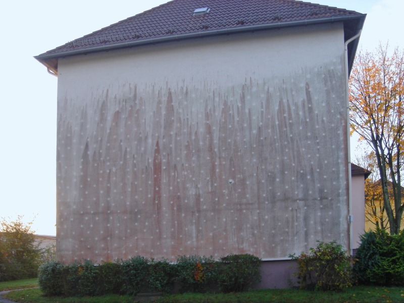 Dübelabzeichnungen an der Fassade sind ein Beispiel dafür, wie nachgeleitete Wärme aus dem Mauerwerk eine Temperaturerhöhung und dadurch eine Verringerung der Feuchtekonzentration bewirkt. Obwohl der Temperaturunterschied zur Fläche in einem einstelligen Bereich sehr gering ist, ist dieser für ein schnelleres Trocknungsverhalten und für einen geringeren Befall ausreichend. Über den Dübelköpfen sind eine saubere Fläche und dadurch hellere Abzeichnungen vorhanden.