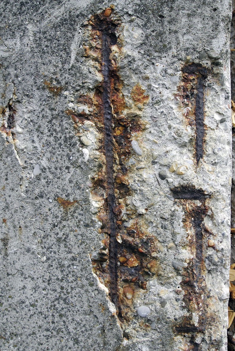 Alle „kranken“ Betonteile müssen bis auf die nicht karbonatisierten Bereiche entfernt werden. Anhand einer Prüfung kann der Handwerker an ausreichend großen Abschlagstellen mittels Vornässen und Einsprühen mit Indikatorlösung (10 g Phenolphthalein auf 1000 ml Methanol, Versprühen mit einer Blumenspritze) erkennen, wie weit der Beton geschädigt ist – gesunder Beton verfärbt sich dann rot.