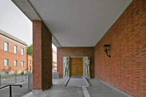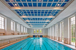 Eine besonders kniffeligen Aufgabe war die Neugestaltung der Decke, da Statiker und Akustiker zeitgemäße Anforderungen stellten, der Denkmalschutz aber längst nicht jedes Material zuließ. „Der Statiker etwa gab vor, dass die Decke nicht schwerer als 20 kg/m2 sein dürfe, da man ansonsten das Dachtragwerk verstärken müsse. Die Denkmalpflege wollte einen schalldämmenden Putz einsetzen, um ein einheitliches optisches Gesamtbild zu erreichen. Doch schnell war klar, dass eine solche Decke viel schwerer als 20 kg/m2 würde“, sagt Tobias Reckert. Statt des Putzes kam eine Decke aus magnesitgebundenen Holzwolle-Akustikplatten („Heradesign fine“) zur Ausführung, welche die Akustik wesentlich verbessert. Unter der 2300 m2 großen Decke sind die alten Stahlbetonträger noch zu sehen. „Mit den flexiblen Plattenformaten konnten wird zwischen den Betonträgern zur Schallbrechung sogar eine Gitterstruktur bauen“, erklärt Reckert.