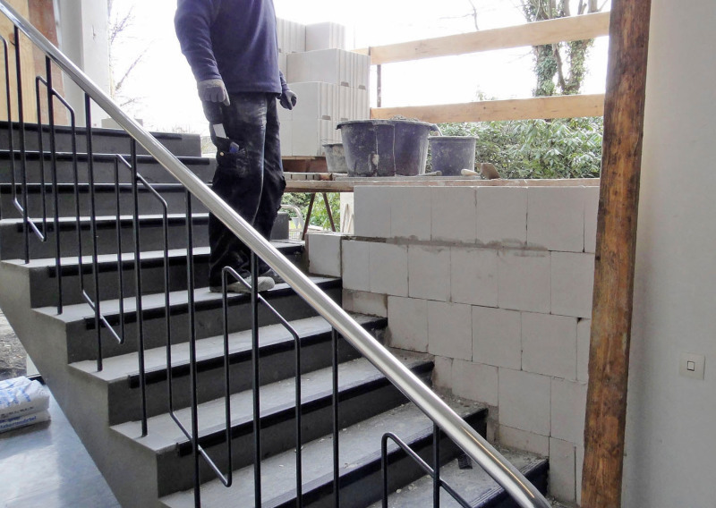Die alte Treppe verfügt noch über ihr ursprüngliches Geländer, ein bemerkenswertes Zeugnis der frühen Moderne, das zwar Bestandsschutz genießt, für Neubauten aber nicht mehr genehmigungsfähig ist – ein „Kindernormkopf“ von 12 cm Durchmesser würde knapp durchpassen, zudem besitzt das Geländer verbotene Horizontalsprossen. Die Erarbeitung eines genehmigungsfähigen Geländerdetails, das auch den denkmalpflegerischen Vorstellungen genügte, war unerwartet planungsaufwendig, konnte aber zur Zufriedenheit aller gelöst werden.
