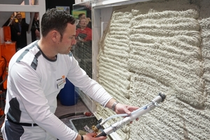 Mit diesem Thema hat sich auch die Firma Sto intensiv auseinandergesetzt und zeigte auf ihrem Stand mit StoSystain R den Aufbau eines WDVS, das ganz ohne Klebemörtel auskommt. Die Dämmung wird per Schraubdübel auf die Außenwand gedrückt. Auf den Köpfen der Tellerdübel befindet sich ein Klettpad mit dem sich die Putzträgerplatten, die aus recyceltem Altglas bestehen, dank des Schlaufenvlies auf ihrer Rückseite per Klettverschluss auf die Dämmung hefte lassen. So können die Bestandteile des Systemaufbaus, der ein Hybrid aus WDVS- und VHF-Fassade ist, sortenrein zurückgebaut und recycelt werden. Interessant wird es, wenn dieses Fassadensystem im Laufe des Jahres von Handwerkern auf einer echten Baustelle ausprobiert wird. Dann sind wir von der Redaktion der bauhandwerk ganz sicher vor Ort mit dabei.