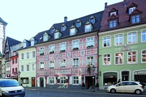Einer der augenscheinlichsten Eingriffe war die künstlerische Neugestaltung der Fassade in den 1950er-Jahren in einer für die damalige Zeit typischen malerischen Umsetzung. Die Siegel der Bärenwirte verewigte Eugen Knosp in der roten Fassade mit den rautenförmigen Ornamenten. Seit jeher arbeitet der Malerbetrieb mit mineralischen Farben von Keim, und auch die rote Bärenfassade wurde seinerzeit mit Keimfarben gestaltet. „Die Fassade hat sich bis heute fast unverändert gehalten“, erklärt Peter Schandelmeyer, Geschäftsführer des Malerbetriebs Knosp.