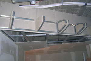 Die übrigen Wände zur Trennung der einzelnen Praxisräume wurden in Wanddicken von 100 beziehungsweise 125 mm erstellt. Als Unterkonstruktion dienten hierfür 50 oder 75 CW- und UW-Profile. Eine 40 mm dicke Trennwandplatte sorgt für die erforderliche Dämmung, die Beplankung erfolgte je nach Feuer- oder Feuchteschutzanforderung mit einer 12,5 mm dicken, doppelten Beplankung aus Bauplatten RB, imprägnierten RBI-Platten oder Rigips Feuerschutzplatten RFI. Alle Trockenbauwände der Praxis erhielten eine Verspachtelung in der Qualitätsstufe Q 3. Auf den gebogenen Wänden wurde zusätzlich ein Vlies eingelegt und anschließend mit dem Fugenspachtel und der verarbeitungsfertigen Spachtelmasse ProMix Plus zu einer glatten Oberfläche verspachtelt. Abschließend trugen die Handwerker einen Anstrich mit Latexfarbe auf.