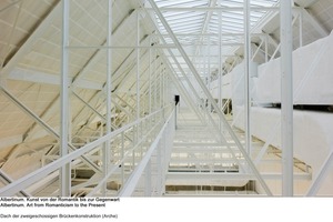 Unter Leitung des Staatsbetriebes Sächsisches Immobilien- und Baumanagement fand sich eine Lösung, die einen Neubau ermöglichte, ohne die wertvolle Bausubstanz des Albertinums zu schädigen: Eine stählerne Fachwerkkonstruktion überspannt den Innenhof und trägt wie eine Brücke den 60 m langen und 2700 Tonnen schweren, zweigeschossigen Werkstatt- und Depotneubau. Allen künftigen Fluten ist die Kunst damit in 17 m Höhe sicher enthoben. Lichtfugen zu beiden Seiten ermöglichen Tageslicht in der so entstandenen großen Halle unterhalb der Überdachung, die auf 1600 m2 Platz für ein Café und einen Buchladen bietet, aber auch für Großveranstaltungen geeignet ist. Der zentrale Raum der Vierflügelanlage bleibt dabei völlig unberührt. Mit dieser technisch und ästhetisch einzigartigen Lösung gelang es dem Berliner Architekten Volker Staab und seinem Team, das Kunstgut flutsicher zu lagern und gleichzeitig einen überdachten Innenhof zu schaffen.