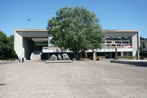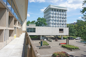 Zum Ensemble gehört auch ein Sitzungstrakt, dessen Faltwerk aus Schwerbeton auf nur vier mit Neopren gefüllten Auflagerpunkten sitzt. Größte Herausforderung bei der Planung der nun anstehenden Sanierung ist der Brandschutz: Die Treppenhäuser sind nicht abgetrennt und auch die ursprünglich vorgesehenen Brandabschnitte hatte man in den 1960er Jahren nicht umgesetzt. Das muss natürlich nachgebessert werden.