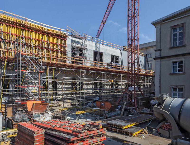 Von außen fast nur aufgrund des Baustellenkrans sichtbar, wurden hinter der Bestandsfassade die Stahlbetonwände und -decken des Westflügels neu errichtet. Für die hohen SB 4 Sichtbetonanforderungen der 12 m hohen Außenwände kombinierte das erfahrene Baustellenteam die außenseitige Vario GT 24 Träger-Wandschalung mit gegenübergestellten, 60 cm breiten Trio Elementen auf der Innenseite. Für die Schalungs- und Bewehrungsarbeiten bei den erhöhten Wandtakten diente das Peri UP Rosett Modulgerüstsystem als 7,50 m hohes Trag- und Arbeitsgerüst.