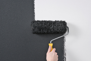 Ist die Oberfläche getrocknet, kehrt der Handwerker die Fläche mit einem weichen Besen von oben nach unten ab. Das Ergebnis ist ein attraktiver Innenraum mit glitzernden, anthrazitfarbenen Flächen – in dem aufgrund der emissionsarmen, weichmacher- und lösemittelfreien Farbe auch ideale Voraussetzungen für ein gesundes Wohnklima herrschen.
