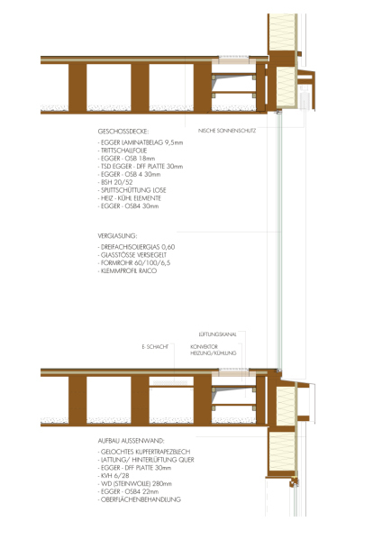 Die als Scheibe ausgeführten Decken beziehungsweise Dachelemente fungieren als Horizontalaussteifung. Die halbseitig offenen Wandschmalseiten der Holzrahmenbau-Boxen sind für die vertikale Leitungsführung der Zu- und Abluft vorgesehen und dienen gleichzeitig als Vertikalschächte für Heiz-, Kühl-, Wasser- und Elektroleitungen. Nach dem Einziehen der Leitungsstränge über alle Geschosse werden sie mit OSB-Platten geschlossen.
