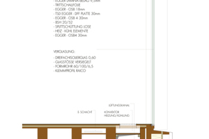 Die Wandschmalseiten der „Box“ sind jeweils beidseitig zur Hälfte mit 18 cm dicken Plattenstreifen aus sechs verklebten Schichten OSB 4 Top beplankt – innen- und außenseitig versetzt angeordnet. In der Summe sind es je Achse vier Wandscheiben, die die Queraussteifung übernehmen. Dazwischen stehen BS-Holz-Stützen im Achsabstand von 2,80 m. Die 11,40 m langen und 2,80 m breiten Deckenelemente liegen entweder auf den Wandkronen oder punktförmig auf den Stützen auf. Spezielle Stahlverbindungsteile schließen die übereinander stehenden BS-Holz-Stützen zusammen.