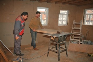 Das über 300 Jahre alte Fachwerkgebäude hatte sehr große Differenzen in den Fluchten der Decken, Wände und Böden. Hier war keine Wand im Lot. Es war nicht möglich, die Dämmplatten direkt auf die zum Teil außerordentlich schiefen und gewölbten Wände zu montieren. Da die Holzfaserdämmplatten für ihre Funktionsfähigkeit vollflächig auf der Wandfläche aufliegen müssen, brachte das Team von Peter Claß auf einer Armierungslage aus Rippenstreckmetall mit der Putzmaschine eine neue Putzschicht auf die Wände auf. Hierfür dürfen ausschließlich rein mineralische Putze als Kopplungsschicht aufgetragen werden, um die kapillare Leitfähigkeit der Holzfaserdämmplatten zu gewährleisten. Im Falle des Heinlinschen Hofs applizierten die Handwerker einen Kalkputz. In den frisch aufgetragenen Putz wurden die Platten nass eingelegt und zusätzlich mit Tellerdübeln befestigt. Diese Vorgehensweise unterstützt zum einen ein rationelles Arbeiten, zum anderen das satte, vollflächige Verbinden der Kopplungsschicht mit der Dämmplatte. Außerdem mussten die Handwerker darauf achten, dass die Ein-Mann-Platten stets versetzt, sprich im „Mauerwerksverbund“ montiert wurde, so dass vertikale oder horizontale Stöße nicht aufeinander fallen. Anschließend sind die Flächen zweilagig mit einem Kalkputz verputzt worden.