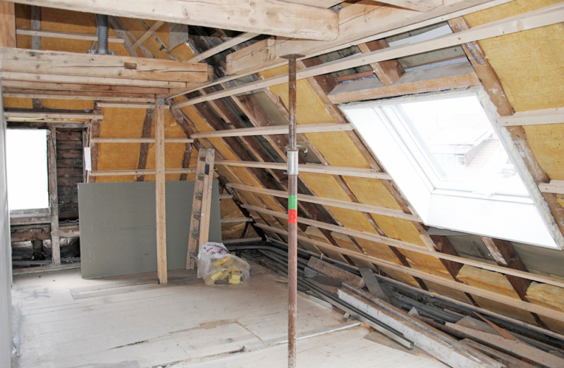 Das Walmdach mit Gauben nach Osten und Westen ließen die Architekten ebenso fast unverändert. Für mehr Tagesicht wurden fünf Dachfenster eingeplant, die auch einen wesentlichen Beitrag für eine gute Belüftung leisten. Raphaela und Bernd Roth freuten sich zudem, dass Dachstuhl und Ziegeldeckung technisch noch gut in Schuss waren. Ein paar Jahre vorher hatten sie die Dachräume zwar schon für ihre Zwillinge etwas modernisiert, dennoch war, angefangen bei der Dämmung, der ganze Innenausbau grundlegend erneuerungsbedürftig.