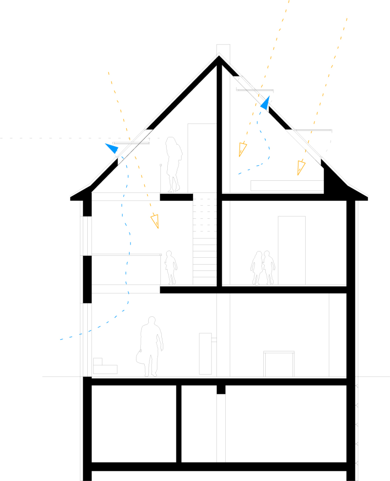 Für das gesamte Innere hieß der Auftrag an die Architekten ohnehin: Die kleinen und engen Zimmer auf allen drei Etagen auflösen, stattdessen eine helle und luftige Wohneinheit von der Kellerdecke bis zum Dach schaffen. „Deshalb war es ein Glücksfall, dass im Gegensatz zum Außenbau innen die Decken und Wände Holzkonstruktionen sind. So konnten wir im Innern nämlich eher einfach schalten und walten“, erklärt Philippe Frey. Der zentrale Entwurfsgedanke stellt deshalb einen spannungsreichen Gegenpol zur verhältnismäßig geschlossen Außenhülle dar: In der Südostecke bricht er die Decken zum Ober- und zum Dachgeschoss in einer Größe von 2 x 4 m auf. Damit schafft er einen kommunikativen Lichthof mit Galerien, der auch als Abluftkamin wirkt. Denn dank der Eigenschaft warmer Luft aufzusteigen, bietet er eine besonders effektive Möglichkeit zu lüften: Werden auf unterschiedlichen Geschossebenen die Fenster geöffnet, steigt die warme, verbrauchte Luft auf und entweicht durch die Dachfenster nach draußen. Dadurch entsteht ein Sog, der kühle, unverbrauchte Luft im unteren Geschoss nachströmen lässt.