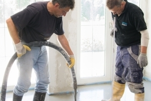 Die Zementspachtelmasse Uzin NC 195 kann als fließfähige Ausgleichsschicht von 3 bis 40 mm eingebaut werden. Sie verbindet sich mit den Fasern des Armierungsgeleges zu einer hochfesten Lastverteilerschicht, die selbst kritische Punktlasten gut aufnehmen kann. An den seitlichen Übergängen kommt es zu einer Durchdringung der Komponenten des Systems, so dass Flächen- wie Punktlasten über den homogenen Verbund sicher in den tragenden Untergrund abgeleitet werden. Die maximale Flächenlast beträgt 4 kN/m2, die Punktlast liegt bei 4 kN. „Für eine schubfeste Verlegung mit 18 mm dicken Eichendielen von bis zu 6 m muss der Unterboden sehr stabil sein und eine hohe Lastaufnahmefähigkeit besitzen“, sagt Uwe Kunzelmann, Estrichexperte bei Uzin. „Dazu wünschen sich die Bauherren meist eine fugenlose Verlegung ihrer Böden. Eine derartig geringe Aufbauhöhe für den Einbau einer Fußbodenheizung verlangt zudem besonders flexible Werkstoffe, etwas Erfahrung sowie exaktes Arbeiten und präzises Messen.“