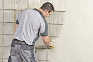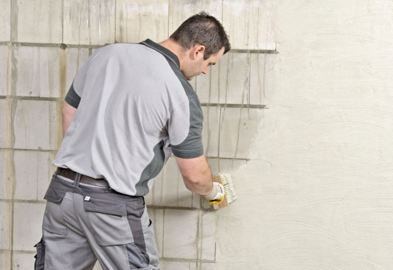 Zu Beginn der Sanierung mit dem „RZ-System“ von Hahne wird die Grundierung „Intrasit Aquarol 10A“ aufgetragen. Anschließend wird der Dichtmörtel „Intrasit RZ1 55HSP“ aufgebracht und mit einer 6 mm Zahnkelle durchgekämmt. Der Mörtel kann 20 Minuten lang verarbeitet werden. Nach etwa einer Stunde ist er fest und bereit, überarbeitet zu werden.