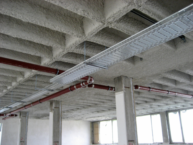 Kramers Institutsbau zeichnet sich durch eine extrem filigrane, materialsparende und dennoch stabile Bauweise aus. Die Betonrippendecken sind nur 5 cm dick, können aber trotzdem bis zu 500 kg Lasten pro Quadratmeter aufnehmen. Das feingliedrige Tragwerk und eine mangelnde Betonüberdeckung stellten die Handwerker bei Brandschutz und Statik jedoch vor Probleme: Um die volle Tragfähigkeit der Decken zu erreichen und sie vor Korrosion zu schützen, schlossen sie vorhandene Risse und überspachtelten freiliegende Bewehrungen. Anschließend rauhten die Brandschutzspezialisten der Firma Minimax die Decken mit einem Sandstrahler an und spritzten einen zementgebundenen Haftgrund auf. Dann trugen sie mit Mischpumpe, Gipsermaschine und Luftschlauch gleichmäßig per Hochdruck einen 15 bis 20 mm dicken Brandschutzputz der Marke Birocoat mit einer niedrigen Rohdichte von 450 kg/m3 auf. „Dadurch konnten wir die notwendige Qualität F60 erreichen und zugleich 4 cm Beton mit 2 cm Spritzputz kompensieren, ohne die Decken zu überlasten“, sagt Roberto Campesino, Bauleiter bei Minimax.
