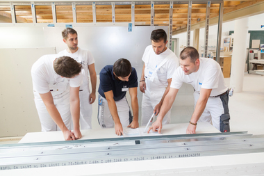Deutschlands höchst gelegene Baustelle befindet sich auf der Zugspitze im Schneefernerhaus. Materialtransporte übernimmt eine Zahnradbahn. Kostenpunkt: gut 1000 Euro pro Fahrt. Durchschnittlicher Takt: einmal wöchentlich. Für einen Umbau in dieser Höhe war daher eine minutiöse Planung gefragt. Um den Forschergruppen in der vor zehn Jahren im ehemaligen Zugspitzhotel gegründeten Station einen angemessenen Aufenthaltsraum zur Verfügung zu stellen, wurde das Kasino des Schneefernerhauses vor kurzem modernisiert und die davor gelegene Terrasse als zusätzlicher Aufenthaltsort im Freien daran angebunden. Weil die Terrasse aber rund 50 cm oberhalb des bisherigen Fußbodens im Aufenthaltsraum lag, musste der Boden im Gebäude selbst erhöht werden, um den Geländesprung auszugleichen. Den passenden Aufbau hierfür fand der mit der Bauaufgabe betraute Architekt Wolfgang Utz aus Grainau über ein Beratungsgespräch mit dem technischen Auskunftsservice von Knauf und dann vor Ort mit Georg Achatz, Knauf Gebietsleiter Bodensysteme im Verkaufsgebiet Süd. „Wir waren auf der Suche nach einem Hohlboden, der unempfindlich ist gegen Feuchtigkeit und der auch extreme Temperaturen problemlos abfängt“, erinnert sich Wolfgang Utz. Gleichzeitig durfte der Boden trotz der erforderlichen extremen Aufstellhöhe nicht hohl klingen. Die Empfehlung lautete daher F182 Knauf Integral GIFAfloor FHBplus 25+18 Flächenhohlboden, also ein zweilagiger Aufbau aus Gipsfaserelementen – einem 25 mm dicken Tragelement und einer 18 mm dicken zweiten Lage. Zusammen mit den Hohlbodenstützen erhöht er die Oberkante des Fußbodens im Aufenthaltsraum um 36 cm. Als Dampfsperre gegen die aus dem Untergrund aufsteigende Feuchtigkeit waren die FHB 25 Platten der ersten Lage unterseitig mit Alu kaschiert. Eine gegen Feuchtigkeit unempfindliche Schüttung brachten die Handwerker Zug um Zug während der Montage ein. Sie wirkt wärmedämmend und erhöht den Schallschutz.