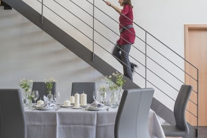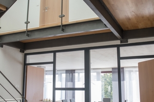 Verbunden werden die verschiedenen Ebenen der modernisierten Scheune durch eine offene Stahl-Holzkonstruktion von Treppen mit angeschlossenen Brückenelementen. Dabei ist die Umsetzung des sich bis zum Dach hin öffnenden Treppenhaus zugleich ein Musterbeispiel dafür, wie durch geschickte Planung frische Luft und Tageslicht bis in die Tiefe eines Gebäudes geführt werden können. Acht Velux Dachfenster auf beiden Seiten des Firstes versorgen den atriumgleichen Treppenhaus bis hinunter ins Erdgeschoss mit viel natürlichem Licht. So kann dort selbst an trüben Tagen meist auf künstliche Beleuchtung verzichtet werden. Darüber hinaus spielen die elektrisch betriebenen Dachfenster in Verbindung mit den Fassadenfenstern der unteren Etagen eine wichtige Rolle bei der Be- und Entlüftung der Innenräume und der Regulierung der Temperatur. Wind- und Temperatur-