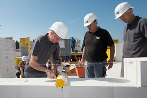Die Vorarbeiten der Maurer von der Reger Bau Gmbh finden sofort den Beifall des Vorführmeisters: „Tolle Baustelle, alles picobello, das habe ich so noch nie gesehen“, sagt Simbert Fröhlich und macht die bauhandwerk-Redakteure auf die Ausführung der ersten Lage aufmerksam. Die liegt nicht nur beeindruckend genau im Mörtelbett auf der Bodenplatte, die Mitarbeiter haben dafür auch einen schmaleren Stein verwendet. Der 24er Ytong-Stein ist an der Kante der Bodenplatte ausgerichtet. Die zweite Lage aus 36,5 cm tiefen Steinen wurde so aufgemauert, dass die Innenwand plan ist. Auf der Außenseite ergibt sich so ein Versatz, der genau mit einer 12 cm dicken Perimeterdämmung gefüllt werden kann. „Tolles Konstruktionsprinzip: Das vermeidet Wärmebrücken, und man kann die Dichtfolie schön nach oben führen und bekommt einen sauberen Anschluss“, lobt Fröhlich.