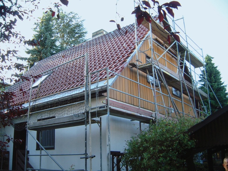 Zunächst mussten die alten Asbestzementtafeln möglichst zerstörungsarm und vorschriftsmäßig demontiert werden, dazu war vorab eine Anmeldung bei den zuständigen Behörden notwendig. Nach Abnhame der Zementplatten wurde auf die freigelegte Holzrahmenkonstruktion eine wasserfest verleimte, 18 mm starke OSB/4-Flachpressplatte aufgebracht.