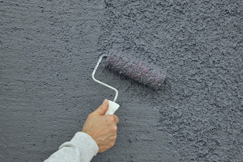 Um eine raue Putzoberfläche in der Rolltechnik herzustellen, zieht der Handwerker zunächst den organischen Oberputz Stolit (im Farbton SCS 34300) in einer groben Kratzputzvariante (K 6) mit der Traufel auf den tragfähigen Putzgrund. Anschließend modelliert er den noch nassen Putz mit der Reliefwalze (Typ Eiche). Mit einer trockenen kurzflorigen Malerwalze drückt er nach kurzem Antrocknen die vorher hochgezogenen Spitzen ein. Nach ausreichender Durchtrocknung des grob modellierten Oberputzes kommt die Fassadenfarbe auf Reinacrylatbasis StoColor Maxicryl – im Farbton 10DC510 – zur Ausführung. In die noch nasse Farbe bläst der Handwerker mit der Trichterpistole schwarzglänzende Partikel (Sto-Siliciumcarbid F14) ein. Die fertige Oberfläche ist stark strukturiert und zeigt ein intensives Licht- und Schattenspiel, das durch die Lichtreflexe des groben Siliciumcarbids weiter gesteigert wird.