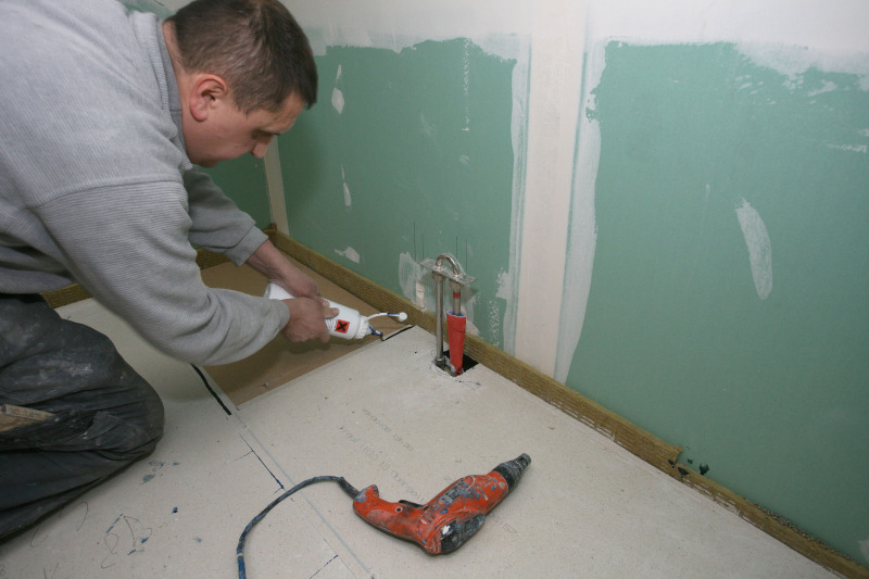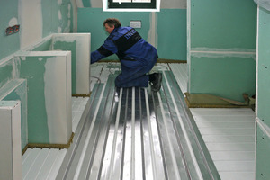 Für die Bäder wurde eine Fußbodenheizung der Bauart B gewählt, das für Fertigteilestriche aus Gipsfaserplatten geeignet und schnell zu montieren ist. In Verbindung mit dem Fertigteilestrich Brio entsteht ein sehr leichter Heizestrich mit einem Gewicht von nur etwa 23 kg/m². Das ist entscheidend bei alten Holzbalkendecken, die statisch nicht zusätzlich belastet werden sollten. Eine für Neubauten übliche Konstruktion mit Fließestrich würde etwa 110 kg/m², mit Zementestrich sogar 130 kg/m² wiegen.