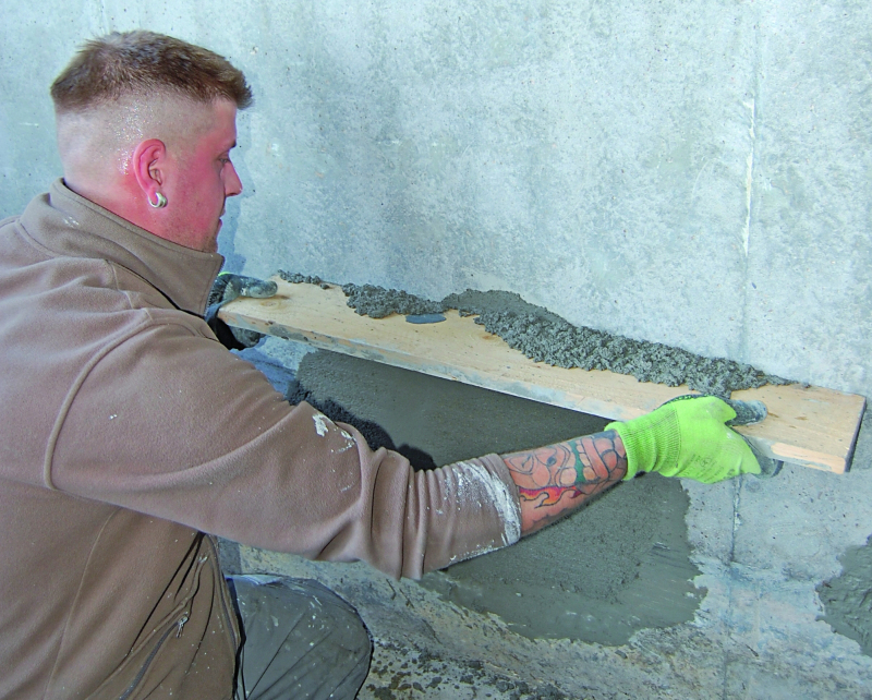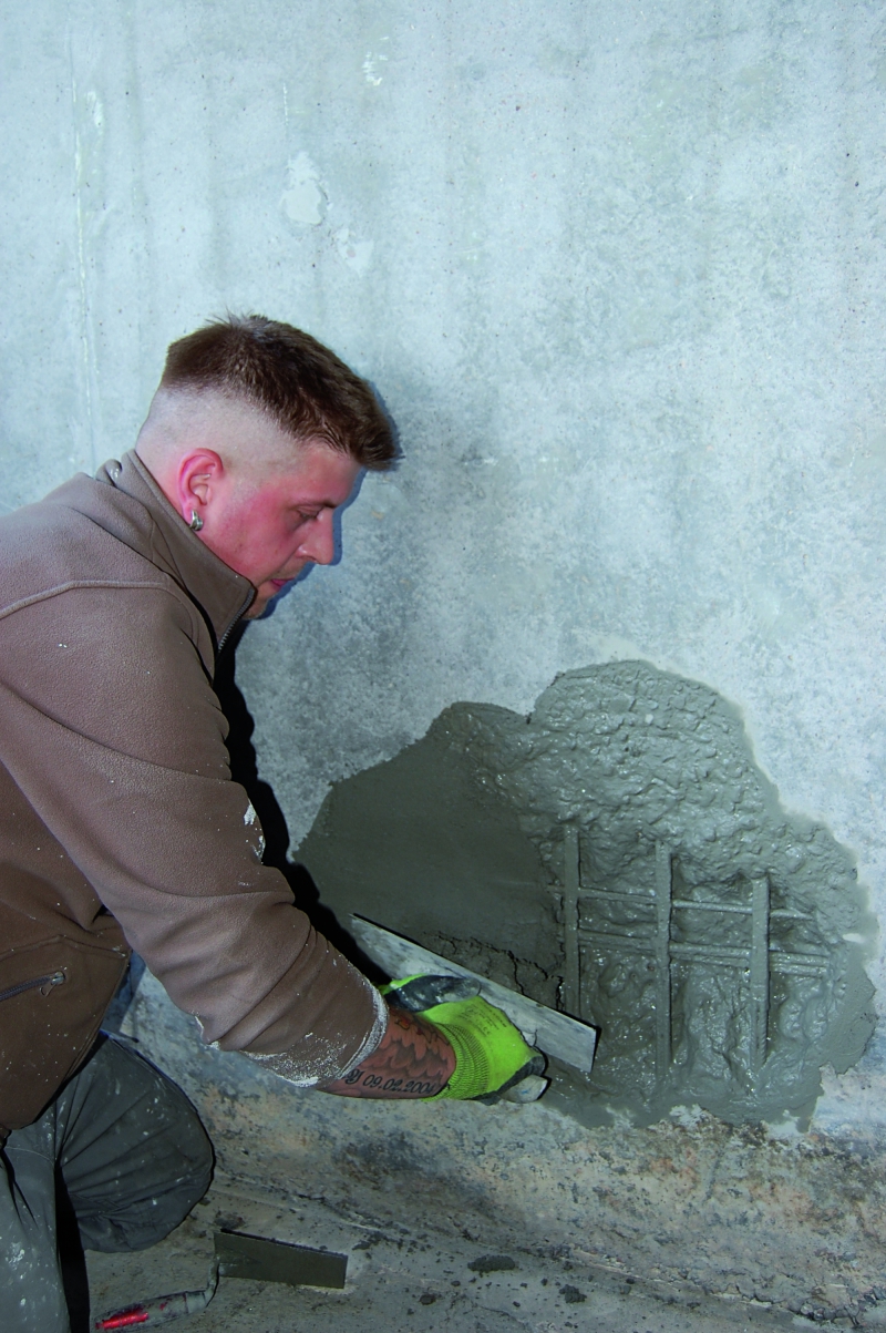 Die Stützen und Wandscheiben – die tragenden Teile für das darüberliegende, zweigeschossige Einkaufszentrum – wurden in Ortbeton hergestellt. Ihre Oberflächen sind als Sichtbeton ausgeführt. Bei den Stützen mit Querschnittsabmessung 50 x 50 cm wurde ein Schädigungsgrad von durchschnittlich 10 Prozent ermittelt, bei den Wandscheiben mit Querschnittsabmessung 250 x 50 cm lag der Schädigungsgrad bei durchschnittlich 5 Prozent. Zum Einsatz gelangte das Remmers „Betofix“ PCC-Betoninstandsetzungssystem. Da es sich um tragende Bauteile handelte, war die Verwendung eines statisch anrechenbaren PCC-Systems zwingend erforderlich. Hauptprodukt ist der einkomponentige Trockenmörtel „Betofix R4“. Der faserverstärkte, werkgemischte, mineralische Trockenmörtel härtet hydraulisch und schwindarm aus. Möglich sind einlagige Auftragsdicken bis 80 mm in einem Arbeitsgang. Durch die Reprofilierung von Stahlbetonteilen mit „Betofix R4“ wird die statische Belastbarkeit und die Passivierung des Stahls wieder hergestellt. Lediglich bei Betondeckung unter 10 mm ist gemäß RL-SIB ein zusätzlicher Korrosionsschutz erforderlich. Der Mörtel vereint Grob- und Feinmörtel in einem Produkt. Optional kann er mit oder ohne Haftbrücke aufgetragen werden.