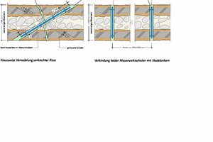 Die senkrechten Risse werden durch schräg (unter 30°) eingebrachte Nadeln regelrecht „vernäht“. Der Höhenabstand der Nadeln sollte hier 60 bis 80 cm betragen. Das Verpressmaterial (Suspension) sollte zudem die gleiche Festigkeit wie der historische Mauermörtel besitzen. Auch hierfür müssen vor Beginn der Arbeiten Mörtelanalysen erstellt werden.