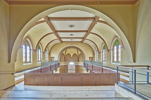 Immer wieder ging es also um Spuren und Schichten, die erhalten, geschützt und gezeigt werden sollten. Spuren erhalten hieß beispielsweise auch, das ornamentale Geländer auf der Brüstung der Frauenempore, das in der Reichspogromnacht zum Teil abgerissen worden war, nicht wieder zu ergänzen. Nur ein schmales Metallprofil sorgt hier für die notwendige Absturzsicherung. Ergänzt wurden hingegen die vom Metallrestaurator Peter Eingrüber nach eigenem Entwurf gefertigten Kandelaber an Brüstung, Bima und Apsis. Auch an dieser Stelle sollte die Geschichte nicht vergessen werden.