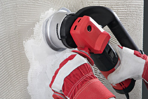 „Man kann mit der Retecflex wirklich fast alle Baustoffe bearbeiten, die einem im Arbeitsalltag so unterkommen können“, bestätigt Michel Klußmann, „Holz, Beton, harte und weiche Putze, Fliesen, Stein, Estrich und Beschichtungen – alles möglich.“ Und auch die elektronisch regelbare Geschwindigkeit des kräftigen 1400-Watt-Motors kam gut an. Für unterschiedliche Werkzeuge und wärmeempfindliche Materialien lässt sich die optimale Drehzahl einfach einstellen. Positiv bewertete der Handwerker die verschiedenen möglichen Griffpositionen – direkt am Motor, am Saugeransatz sowie an dem im 90-Grad-Winkel angebrachten Handgriff mit Vibrationsdämpfung. Die Griffmöglichkeiten, so Klußmann, gewährleisten ein umstandsloses beidhändiges Arbeiten. Ebenso umstandslos gestaltete sich der Werkzeugkopf-Wechsel: Schnell, einfach und sicher in der Befestigung lassen sich die unterschiedlichen Köpfe mit dem großen Stirnlochschlüssel am Gerät arretieren. Zum komfortablen Wechsel trägt nicht zuletzt auch der Werkzeugkoffer bei: „Der Transportkoffer ist schön groß und gut aufgeteilt. Da fliegt nichts so leicht durch die Gegend und