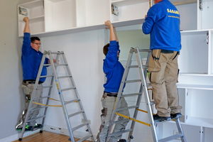 Vor der eigentlichen Montage entfernten die Handwerker die Dreikantleisten von den Fußleisten und montierten die Konsolenfüße unter die beiden unteren Schrankelemente. Danach schoben sie ein Sockelelement als Blende zwischen Fußboden und Unterschrank. Wichtig war es, das rechte, insgesamt größte Schrankelement trotz der vergleichsweise krummen und schiefen Wände der Altbauwohnung mit der Wasserwaage exakt ins Lot zu bringen, denn an diesem richten sich alle weiteren Elemente aus.