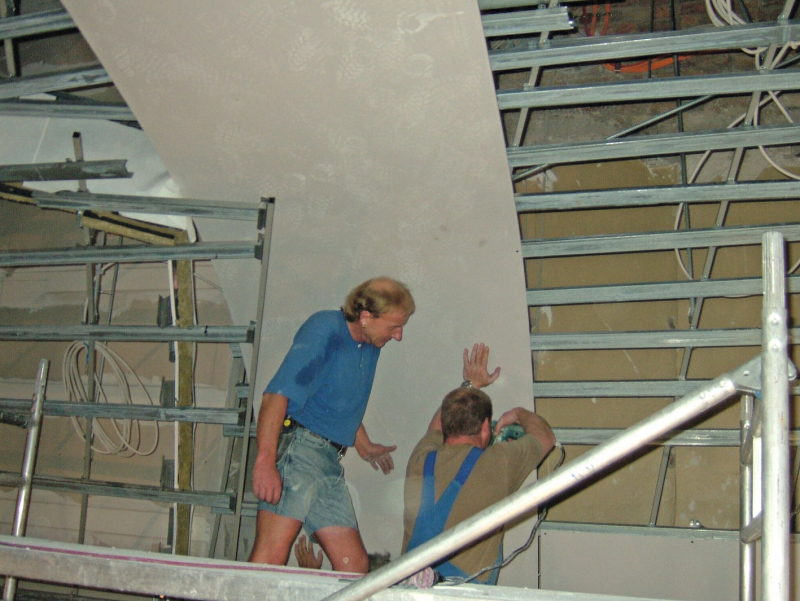 Betrachtet man die Spantenkonstruktion, so wird schnell deutlich, wie entscheidend die gute planerische Vorarbeit und die Werkzeichnungen des Trockenbauteams waren: Die einzelnen Spanten verfügten nicht nur über unterschiedliche Maße und Biegeradien, sondern mussten auch äußerst exakt ausgerichtet und befestigt werden, um die Radialausrichtung der Schuppen zum später errichteten Dozentenpult hin sicherzustellen. Hierzu wurde der Grundriss als Aufriss auf dem installierten Flächengerüst angelegt.