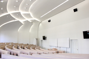 „Im hinteren Saalbereich und an den Seiten erwachsen die einzelnen Felder der Schuppendecke aus diesen Vorsatzschalen. Das gibt dem Ganzen einen sehr fließenden, harmonischen Eindruck“, so Trockenbauprofi Damm. Eine Harmonie, die im fertigen Zustand so leicht und selbstverständlich wirkt, von Detlef Damm und seinem Team jedoch zu jedem Zeitpunkt hohe Konzentration forderte: „Kein Deckenfeld glich dem anderen. Die Bestuhlung und die Anordnung des Dozentenpults ließen keine Toleranzen in der Decken- und Wandausbildung zu. Und das alles musste in einem schiefwinkligen Raum eingemessen und exakt montiert werden. Schwierige Anforderungen, die wir auch durch die meiner Meinung nach vorbildliche Zusammenarbeit mit den Architekten erfolgreich gemeistert haben.“