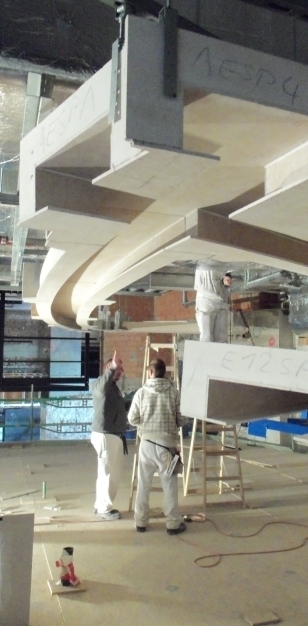 Die seitlichen Wandverkleidungen des Zuschauersaals erstellten die Trockenbauer als Vorsatzschalen – in unterschiedlichen Radien gebogen und zugleich vertikal um 3 Grad geneigt. „Für diese Sonderkonstruktionen mit bis zu 8 m Höhe, die wir gemeinsam mit Rigips-Fachberatern entwickelt haben, waren Standsicherheitsnachweise notwendig“, so der Bauleiter. Die Basis für die Wände bildete eine rückseitige Knaggenkonstruktion in Sandwichbauweise aus Rigidur H, darauf eine Unterkonstruktion aus Schwingbügeln und CW 50-Profilen zur Aufnahme der Resonanzabsorber, die ebenfalls in Sandwichbauweise aus Rigidur H und biegsamen Glasroc F Platten in 6 mm Dicke gefertigt wurden. Der untere, von Anpralllasten beanspruchte Wandteil wurde mit einer doppelten Lage Hartgipsplatten beplankt. Diese Leistungen überzeugten sowohl die Jury der Rigips Trophy 2013/2014 als auch die der Saint-Gobain Gypsum International Trophy.