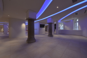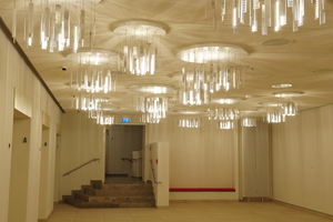 Montagegenauigkeit sowohl bei den Abhänge- und Unterkonstruktionen als auch bei der Ausbildung der dreidimensional geschwungenen Lochdecken erforderten die integrierten Leuchtenkanäle – eines der optischen Highlights im großen Saal. Diese Elemente fertigte die für außergewöhnliche Vorfertigungselemente bekannten Gewölbetechnik- und Ausbauspezialisten der Voringer GmbH Sie aus Rigidur H-Gipsfaserplatten vor, so dass diese vor Ort nur noch exakt eingepasst werden mussten. Besondere Erschwernis dabei: Die Lichtbänder sollten optisch nahtlos von der Decke in die Wandflächen übergehen. Die Lichtkanäle mit integrierter Beleuchtung stellen ein wesentliches Gestaltungselement dar. Rund 300 mm breit und 200 mm tief verlaufen sie bogenförmig innerhalb der Decken- und Wandverkleidungen. Etwa 113 laufende Meter durchleuchten die Deckenflächen, etwa 107 m entfallen auf die Wände. Gerade die gebogenen Geometrien der Lichtkanäle ergaben eine Reihe komplexer Herausforderungen: So gab es eine Vielzahl nicht rechtwinkliger Kreuzungspunkte. Es mussten passgenaue Übergänge in die Kanäle der vertikal angrenzenden Wandverkleidungen geschaffen werden, obwohl diese erst zu einem viel späteren Zeitpunkt montiert werden konnten. Durch die teils extreme Deckengeometrie wurden Trennfugen notwendig, die für den Zuschauer unsichtbar in den Übergang zwischen den Lichtkanälen und der Sichtdecke integriert sind. Besonders eindrucksvoll und kontrastreich wirken die Lichtkanäle heute nach Inbetriebnahme im Zusammenwirken mit den in einem dunklen Rot gestrichenen Decken- und Wandflächen.