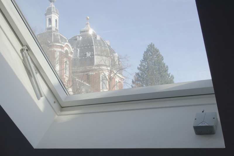 Unter der Treppe im Erdgeschoss wurde zudem ein starkes Gebläse installiert, das im Brandfall anläuft. Es saugt aus der offenen Tordurchfahrt Außenluft an und bläst diese in das Treppenhaus ein. So wird ein geringer Überdruck im Treppenhaus erzeugt, der ein Verrauchen desselben verhindert. Zudem existiert im Dach darüber ein Flächenfenster, das als RWA-Klappe fungiert. Eine elektrische Steuerung sorgt dafür, dass ein gewisser Überdruck nicht überschritten wird – kurz vorher öffnet sich das Dachfenster kurzzeitig. Nach Unterschreiten des Grenzwertes schließt es sich sofort wieder. Eingebaut wurde die Brandschutzanlage durch die Firma Petri Sicherheitstechnik aus Herzogenrath.
