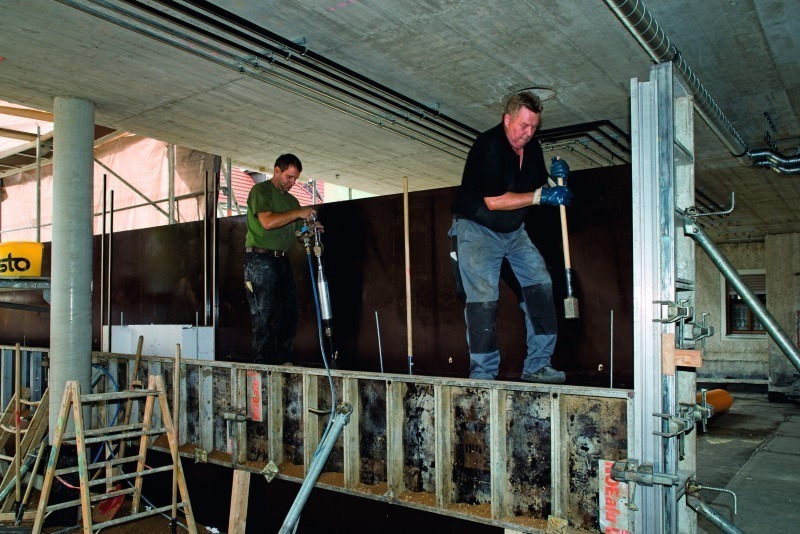 Für sein Objekt in Bludenz setzte Thomas Glück 2750 mm hohe NOEalu L Schalelemente hauptsächlich liegend ein. Der maximale Betondruck beträgt 60 kN/m². Bei der Verdichtung des Stampflehms treten jedoch wesentlich größere Kräfte auf, weshalb es notwendig war, die Schalung zusätzlich durch Gurtungen zu unterstützen. Thomas Glück sagt hierzu: „Hinsichtlich des Handlings ist die NOEalu L Handschalung sehr gut und eignet sich für Projekte dieser Art ideal. Eine Alternative für größere Projekte ist für mich aufgrund des höheren zulässigen Druckes die NOEtop von NOE.“