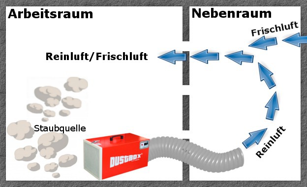 gesetzt werden. Derart abgesaugte Werkzeuge sind zwar auf dem Vormarsch, aber längst noch nicht überall in Anwendung. Hinzu kommt, dass selbst mit guten Systemen der Staub nicht vollständig erfasst wird und für viele Tätigkeiten solche Systeme nicht verfügbar sind. Um die Beschäftigten dennoch wirksam zu schützen, sollten Bauluftreiniger eingesetzt werden. Mit geeigneten Hochleistungsluftreinigern werden die Aerosole und Stäube am Arbeitsplatz nicht nur zuverlässig und effektiv erfasst, sondern auch vollständig abgeschieden. Bereits im reinen Umluftbetrieb – als „Raumluftreiniger“ in den Arbeitsraum gestellt – sorgen die mobilen Geräte für hohe Luftwechselraten und eine erhebliche Staubreduktion.