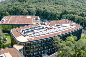 Zentrales Anliegen der Planer war, eine hohe Aufenthaltsqualität für die etwa 500 hier tätigen Wissenschaftler und Mitarbeiter zu schaffen, ohne Abstriche an der erforderlichen Funktionalität machen zu müssen. Dies erreichten sie unter anderem durch lichtdurchflutete Innenräume und ein freundliches, helles Ambiente in den Gebäuden mit elegant abgerundeten Formen und großflächigen Verglasungen. Bei zwei der drei Gebäude entschieden sich wulf architekten dafür, sie von oben mit „Velux Modular Skylights“ zu belichten. Im Hauptgebäude öffnet ein Atrium-Lichtband mit insgesamt 28 sowohl feststehenden als auch RWA-Modulen, einer Länge von fast 7 m und einer Breite von etwa 11,5 m das Zentrum des Gebäudes und lässt das Tageslicht herein. Durch das ständig wechselnde Wetter und den Lauf der Tageszeiten ergibt sich auch tief im Inneren des Gebäudes ein faszinierendes Spiel von Licht und Schatten. „Licht ist eines der wichtigsten Werkzeuge eines Architekten. Es macht Architektur erst lebendig“, ist sich Steffen Vogt, Partner bei wulf architekten, sicher.
