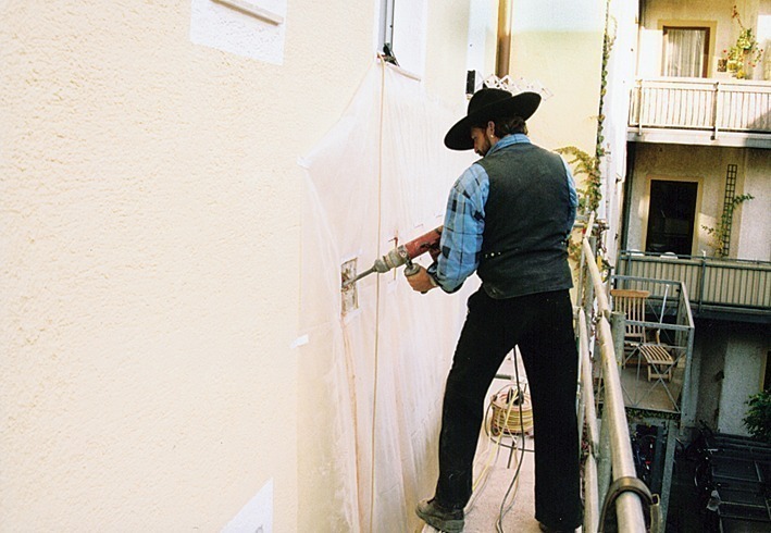 Sowohl beim Neubau als auch bei der Sanierung kann nach Kontrolle des Schuhs beziehungsweise der Hülse mit der Wasserwaage die Montage des Holzbalkons beginnen: Nach dem Reinigen der Hülse mit einem Handfeger werden die Leimholzbalken für den Balkon eingeschoben und anschließend die seitlichen Fugen zwischen Balken und Hülse ausgeschäumt. Nach dem Auflegen eines Pappstreifens auf dem Balken kann darauf die Metallabdeckung montiert werden. Die Metallabdeckung sollte dabei mit einem Dachprofil am Putz der Außenwand anstehen. Sie wird anschließend mit Acryl abgedichtet. Danach können Balkonbelag und Geländer montiert werden. So kann der Balkon später auch wieder ausgewechselt werden, ohne dass die Fassade dadurch beeinträchtigt wird.