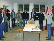 Die Kombination aus dem glattem Fries und Trapezdecke erwies sich auch für die weitere Planung und Ausführung als ausgezeichnete Lösung wie Stuckateur Jens Gaus aus Fluorn-Winzeln erklärt, der alle Putzarbeiten in der Geschäftsstelle ausführte und auch die Montage der Decke übernahm. „Wir haben zuerst die GK-Unterkonstruktion eingebaut, an die zugleich die oberen Enden der geschlossenen und der gläsernen Trennwände der Geschäftsstelle anschließen. Es treffen also niemals eine senkrechte Wand und ein waagerechtes Trapez direkt aufeinander, wodurch sich stets sowohl technisch als auch gestalterisch klare Anschlüsse ergeben. Als Randprofil der Friese dient jeweils eine CD-Schiene, an die wir den Randwinkel für das Trapez-System anschrauben konnten, sodass auch in der Deckenfläche saubere Übergänge gesichert sind.“ In den Freiflächen zwischen den Friesen montierten die Handwerker anschließend die zum Trapez-System gehörige Unterkonstruktion „OWAline S 15b“ montiert, die trotz der späteren Trapezform ein rechteckiges Grundraster bildet. In jedes Feld wurden anschließend die Mineralplatten mit der markanten Diagonale eingelegt.