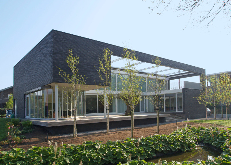 Als Kubus präsentiert sich die Villa Friederich im Villenpark Nieuw Stalberg am Rand von Venlo. Dem städtebaulichen Konzept für die neue Siedlung folgend hat Architekt Rob Kleuskens vom Büro Loxodrome design & innovation die geradlinige Villa in grünem Umfeld entworfen. Der gestreckte Bau folgt mit einer langen, durchbrochenen Front an der Südseite und einer geschlosseneren Nordfassade dem Verlauf des nördlich erschließenden Hinsbeckerwegs und fügt sich ruhevoll in seine Nachbarschaft ein. Für die Fassade der Villa hat sich Loxodrome design & innovation für Hagemeister Klinker der Sorte „Alt Berlin“ entschieden. „Wir wollten einen Ziegelstein, der den Entwurf in all seiner Geradlinigkeit unterstreicht”, sagt Rob Kleuskens. Der Klinker untermauert dies unter anderem durch sein langgestrecktes Format (290 x 90 x 51 mm). Die verklinkerte Gesamtfläche beträgt 6000 m². Durch die Fassade wird die horizontale Ausrichtung betont, indem die Stoßfugen nicht ausgefüllt werden und die Ziegelsteine Kopf an Kopf liegen. Der Maurer hat die Längsfugen mit einem dunkleren Farbton ausgearbeitet. Auf diese Weise erscheint die Fassade von Weitem als ebenmäßige Fläche. Aus der Nähe betrachtet erreichte Kleuskens jedoch einen anderen Effekt: „Von Nahem wollten wir eine Fassade, die plastisch ist, lebendig, mit Farbnuancen und mit der Textur von Ziegelsteinen und Maurerhandwerk. Das ist auch der Grund, warum wir uns für einen speziellen Verband entschieden haben.”