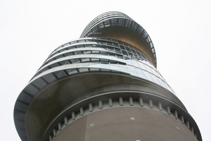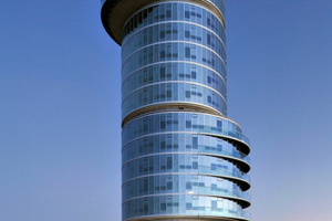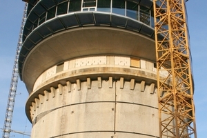Die nun folgenden Schalungsarbeiten für die insgesamt 15 im Grundriss eiförmigen, 3,75 m hohen Geschosse, die zu drei gegeneinander verdrehten Paketen à fünf Geschossen und jeweils über ein 1,8 m hohes Zwischengeschoss miteinander verbunden sind, stellten hohe Anforderungen an die Schalungsarbeiten der Rohbauer, denn hier musste zum überwiegenden Teil Sichtbeton der höchsten Klassifizierung erreicht werden. Hierzu montierten die Mitarbeiter der Bauunternehmung Peter Holthausen pro Geschoss drei Schaltische, die sie per Kran in die Höhe transportierten und auf der jeweils obersten Ebene wie Tortenstücke zusammenfügten. „Für das oberste Geschosspaket mussten die Handwerker eine auskragende Spezialschalung bauen“, erinnert sich Udo Teigelkötter, denn hier kragen die Geschossdecken über einen Stützring bis zu 4,5 m weit aus.
