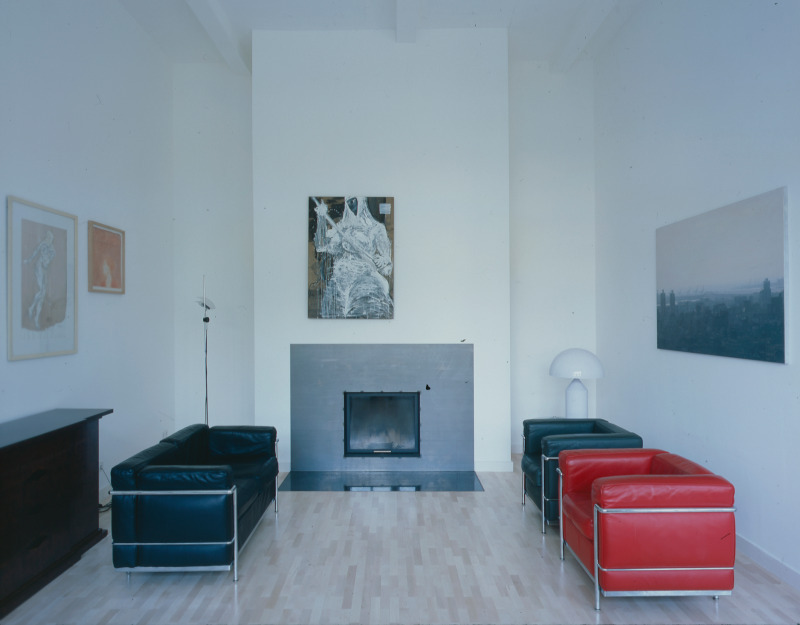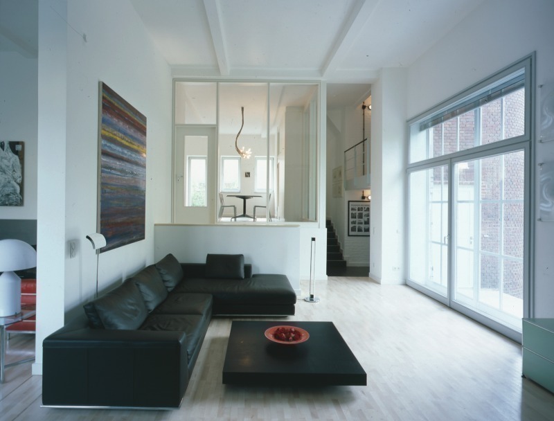 Natürlich mussten nicht nur die Fensterleibungen, sondern das gesamte Gebäude im Zuge der Umnutzung wärmetechnisch aufgerüstet werden. Hierzu mauerten die Handwerker hinter die bestehenden,25 cm Ziegelaußenwände 11,5 cm dicke Hochlochziegel (Poroton), die in Kombination mit einem 2 cm dicken, im Spritzverfahren aufgetragenen Wärmedämmputz für eine zeitgemäße Dämmung und bauphysikalisch zugleich für ein angenehmes Raumklima sorgen. Auch das Stahldach mit einer Hohlziegelfüllung erhielt eine zusätzliche Dämmung und eine Zinkblechdeckung. Die Stahlsteindecken wurden zur Verlegung einer Fußbodenheizung genutzt – je nach Nutzung liegt darauf Parkett, Teppich oder Linoleum. Auch die ehemaligen Trafotüren blieben – mit neuen Verglasungen versehen – erhalten. Die Trafo-Einbringtrassen wurden hingegen entfernt und durch eine großzügige Terrasse ersetzt. Dadurch sind die Wohnräume jetzt mit dem Garten verbunden. Die für die neue Raumaufteilung erforderlichen Innenwände bauten die Handwerker in Trockenbauweise aus Leichtbauwänden und verglasten Holzständerwänden auf. Lediglich die Wohnungstrennwände mauerten sie konventionell aus Kalksandstein.