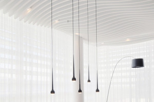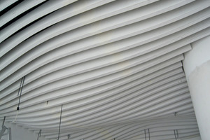 Ursprünglich war auch im Bereich der Lounges eine geschlossene Decke vorgesehen. Da aber eine Vielzahl an Revisionsklappen vorgeschrieben ist, hätte diese Lösung optisch nicht überzeugt. Deshalb entschloss sich Architektin Tina Assmann für eine offene Deckenkonstruktion. Gestalterisch greifen die Deckenlamellen die landestypische Berg- und Hügellandschaft auf. Konstruktiv war die Verschiebbarkeit der Lamellen eine wesentliche Voraussetzung, um den Zugang zu den zahlreichen Installationen sicherzustellen. Dies gewährleistet eine ausgeklügelte Unterkonstruktion: Diese Sonderanfertigung ist statisch so ausgelegt, dass sie sich jeweils über maximal vier Lamellen verschieben lässt. Dazu ist die Abhängekonstruktion zunächst mit je einem Einhängehaken am innenliegenden Holzkern einer jeden Deckenlamelle befestigt. Zusätzlich ist die Abhängung in einem durchlaufenden und vorgestanztem Einhängeprofil (Feinrost) arretiert. Die mit der Ausführung betraute Lindner AG hatte bereits Erfahrungen mit Metall-Lamellen gesammelt. Eingehängte Gips-Lamellen waren für sie ebenso Neuland, wie für den Hersteller Siniat (ehemals Lafarge Gips).
